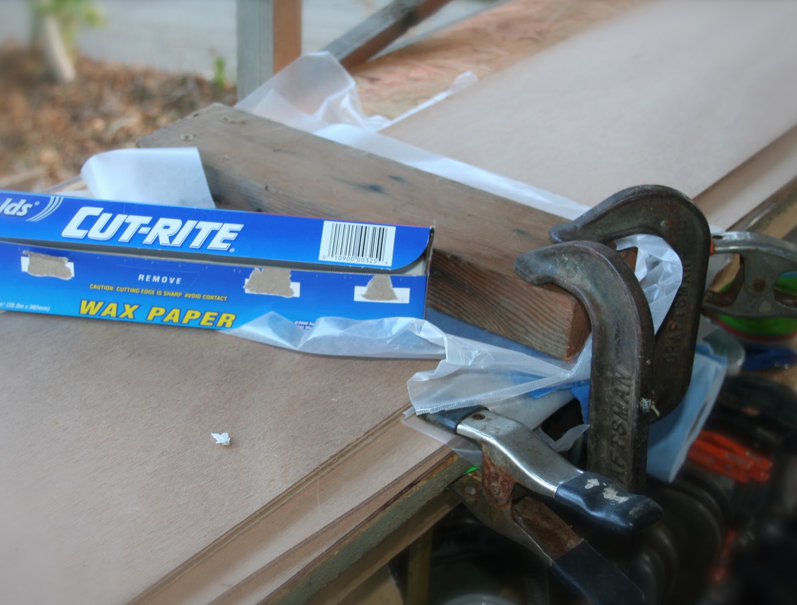 The other thing to get right is clamping the joints. Because you've cut little ramps into the wood, and you'll be lathering them up with slippery glue mixed with a bit of thickener (I used dust from the bag of my finishing sander), they have a tendency to slide apart if you don't clamp them down really well along the length of the boards. Alternatively, you can apply the glue, line things up, then hammer a couple little finishing nails through the scarf joints to keep them from sliding. And of course, before you do that, put tape along the scarf lines (both sides) and wax paper between the sheets to keep the scarf joints clean along the glue lines and the sheets from sticking together when the excess glue squeezes out. If you look closely, you can see the blue painter's tape under the board. It's on each side of each panel. To supply the clamping force, I cut a 2x4 a couple inches longer than the blanks are wide, and I screwed one end of it to the benchtop and clamped the other to the edge of the bench. Now it's just a matter of waiting for the epoxy to react...